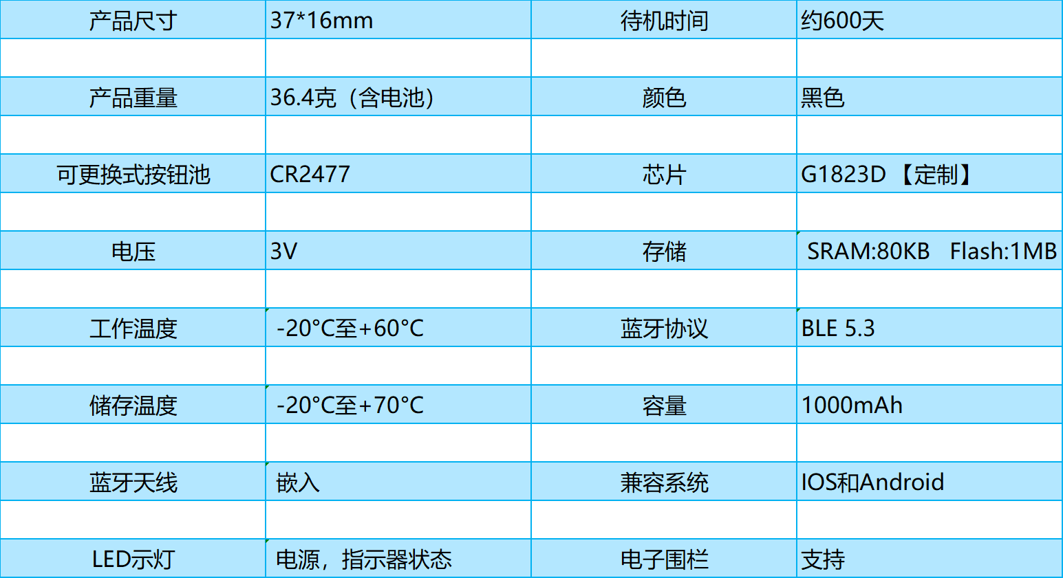 | 产品尺寸 | 37*16mm | 待机时间 | 约600天 |